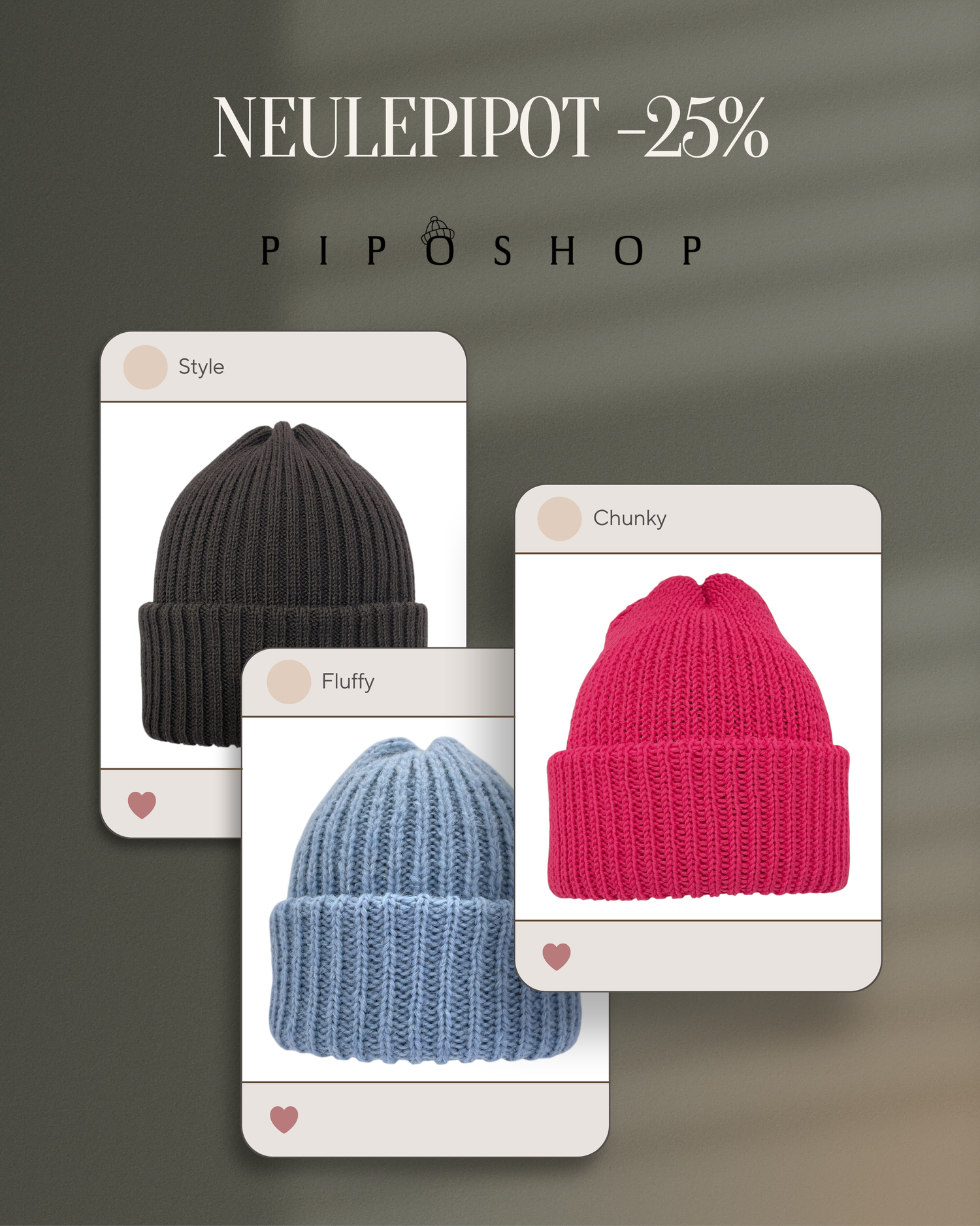 Neulepipot nyt -25%. Tarjous koskee Chunky, Fluffy ja Style pipoja. Alennus lasketaan suoraan ostoskorissa.